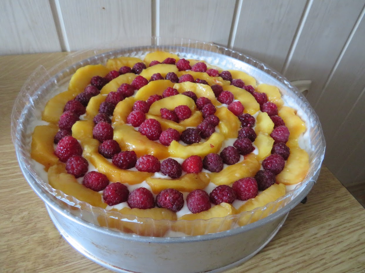 To już będzie góra, więc wyrównać i ułożyć ładnie owoce. Ja na tym etapie podwyższam tortownicę, wkładając plastikowy pasek: